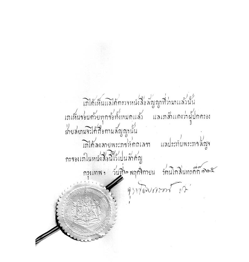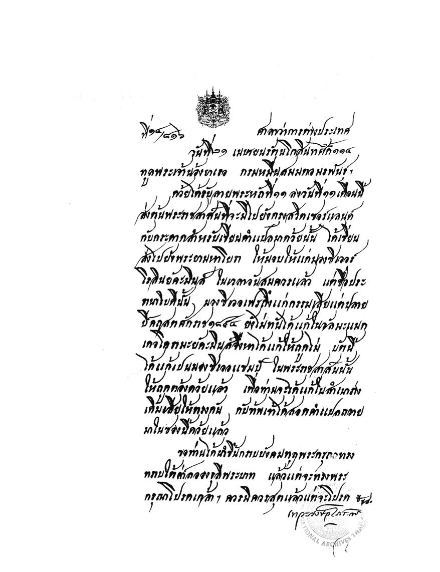 ส่วนเอกสารฉบับภาษาไทยได้มาจากสำนักหอจดหมายเหตุแห่งชาติ เอกสารรัชกาลที่ 5