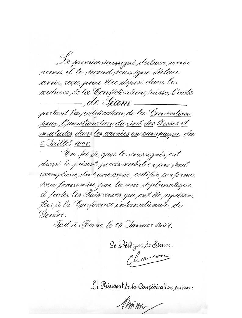 แสดงการเข้าร่วมให้สัตยาบันต่ออนุสัญญาเจนีวา เมื่อ พ.ศ. 2438